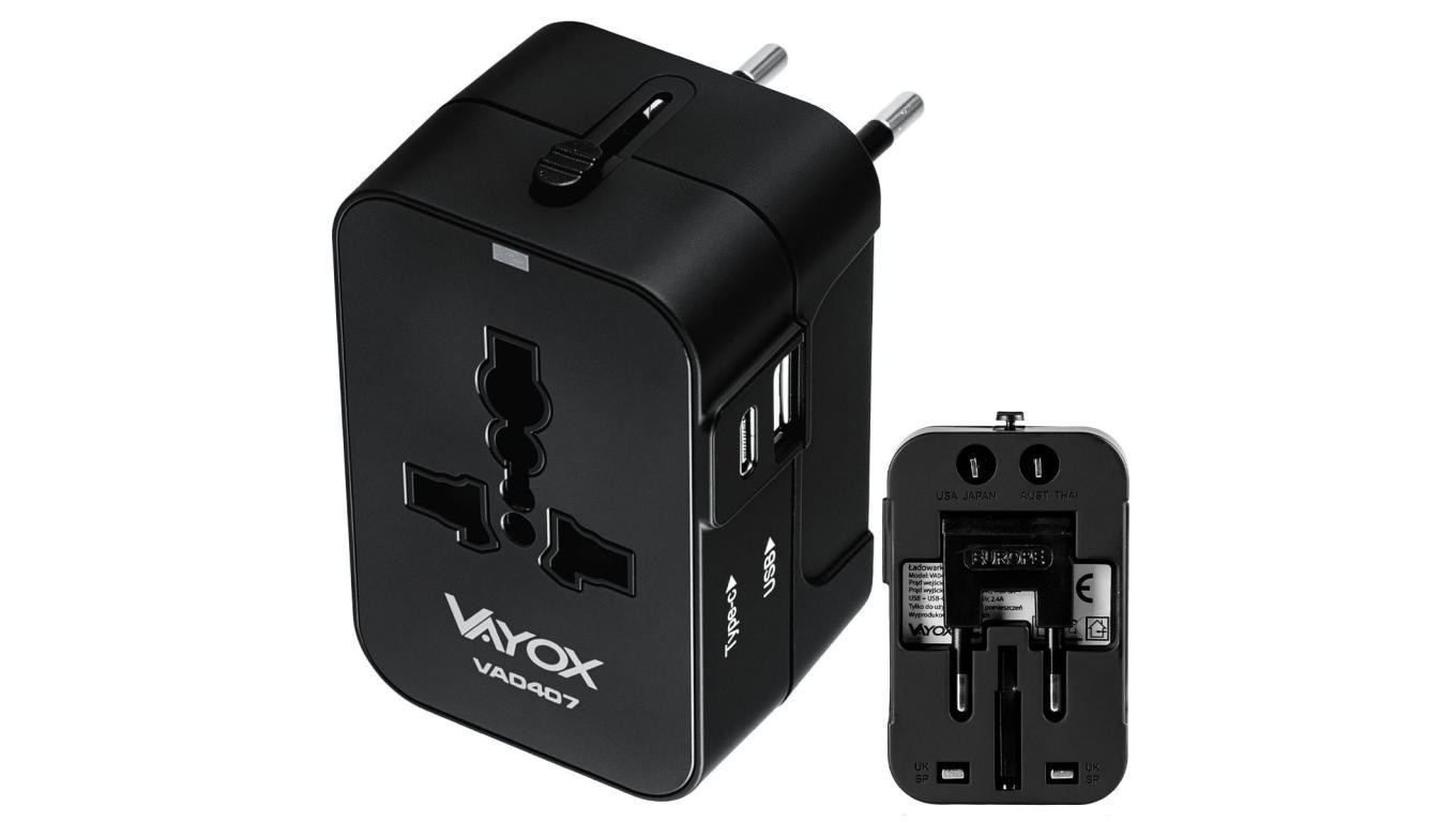Adapter podróżny UK/US/EU/AU z ładowarką USB-A, USB-C 100V-240Vac 6A 1500W czarny VA0407 Vayox