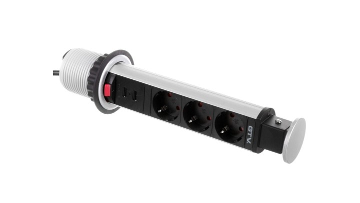 Biurkowy przedłużacz wpuszczany fi 60mm srebrny 3x SCHUKO 2x USB 2,1A 5V AE-BPW3S60U-80