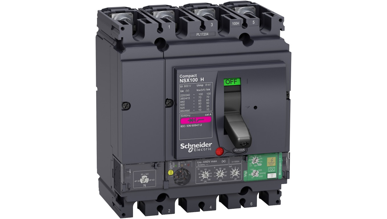Circuit breaker Compact NSX100H, 70 kA at 415 VAC, Micrologic 4.2 Vigi trip unit 100 A, 4 poles 4d LV433867