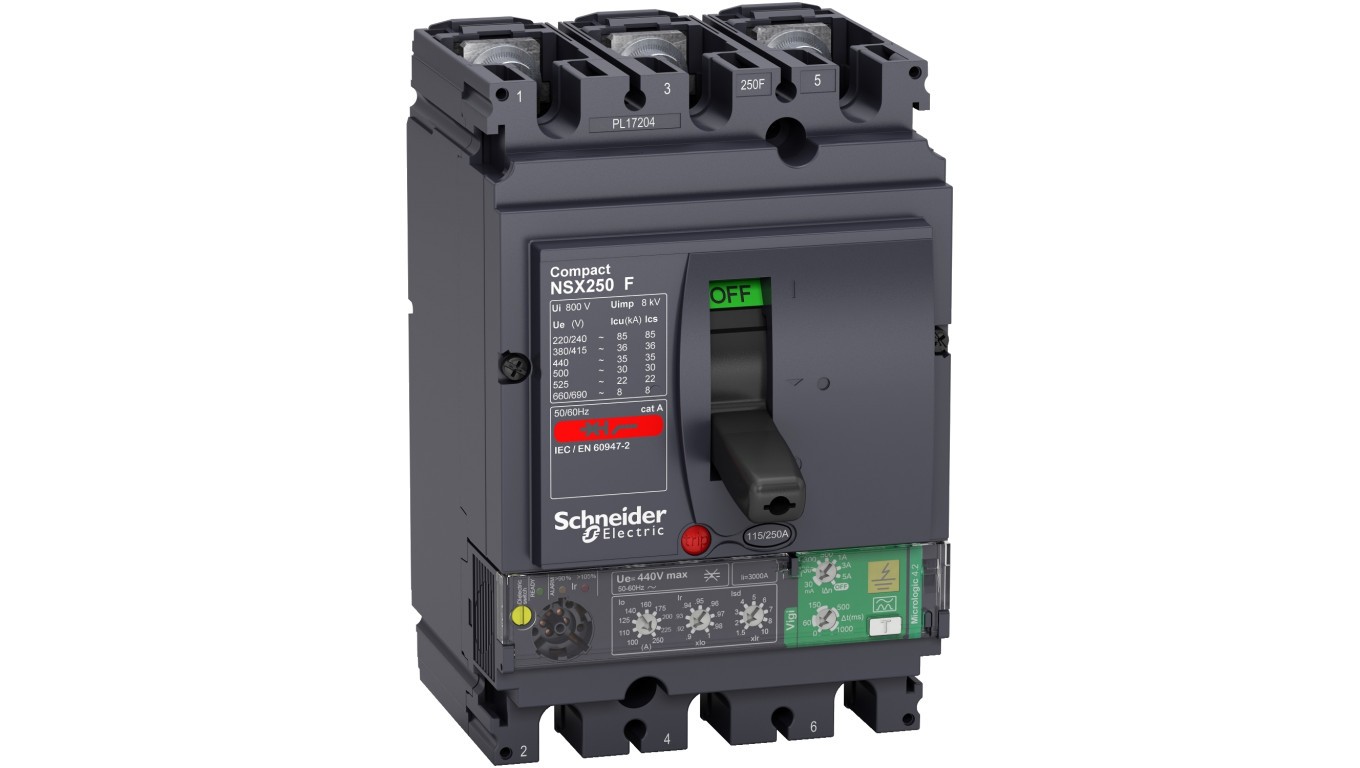 Circuit breaker Compact NSX250F, 36 kA at 415 VAC, Micrologic 4.2 Vigi trip unit 250 A, 3 poles 3d LV433832