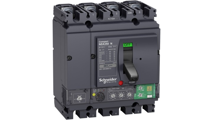 Circuit breaker Compact NSX250N, 50 kA at 415 VAC, Micrologic 4.2 Vigi trip unit 100 A, 4 poles 4d LV433854