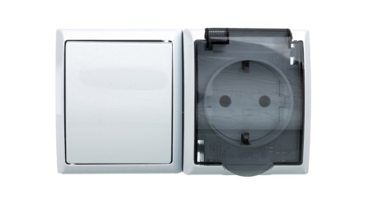 FALA Łącznik hermetyczny pojedynczy + gniazdo z/u Schuko z klapką przezroczystą białe ZH-Ł1GS/00/d