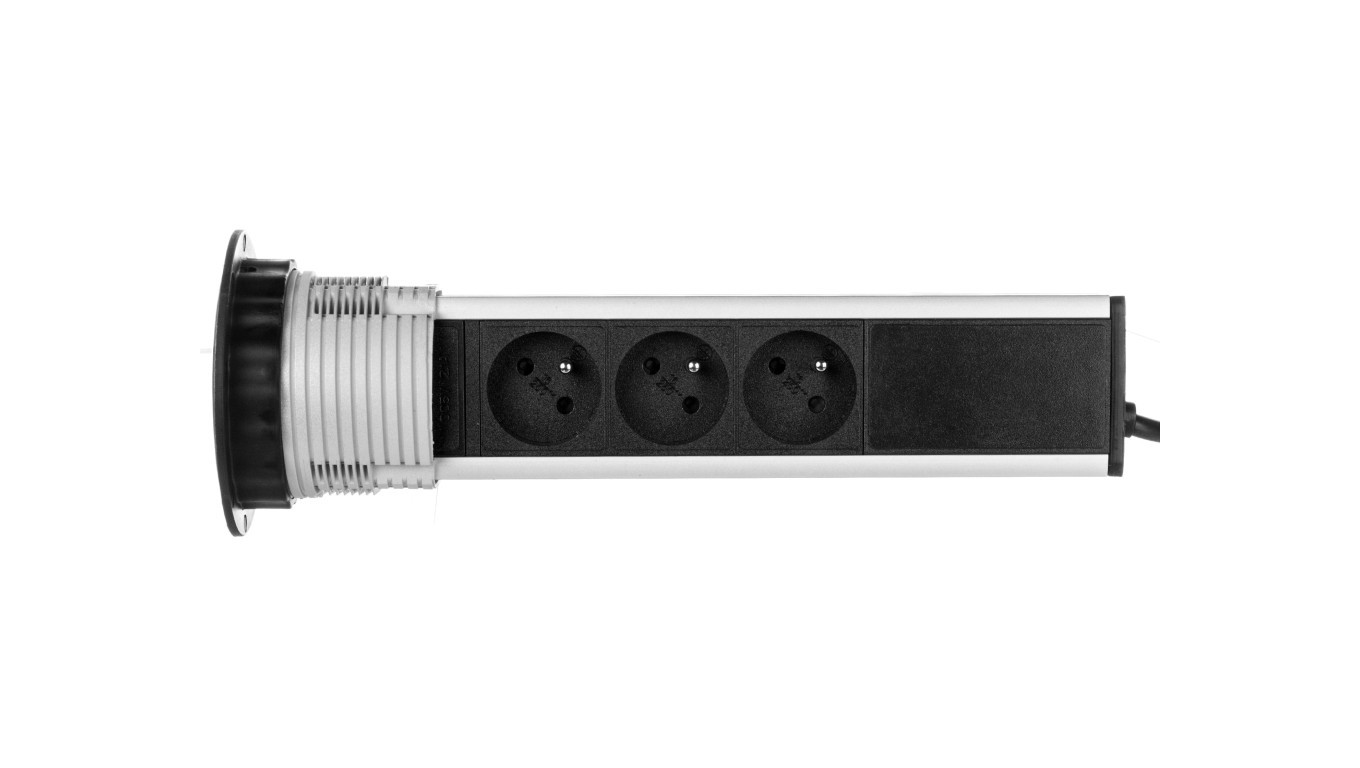 Gniazdo meblowe fi8cm, 3x250V AC wysuwane z blatu z ładowarką USB i przewodem 1,8m srebrne OR-AE-1357