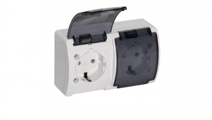 Gniazdo zasilające podwójne natynkowe hermetyczne IP44 białe z klapką dymną 2x 2P+Z Koala SCHUKO ViPlast