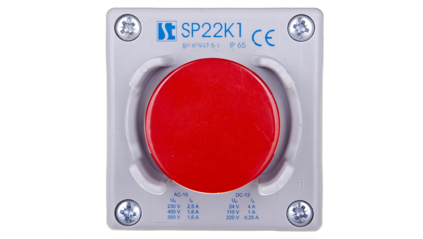 Kaseta sterownicza 1-otworowa przycisk grzybkowy z osłoną czerwony 1R szara IP65 SP22K1"25-1