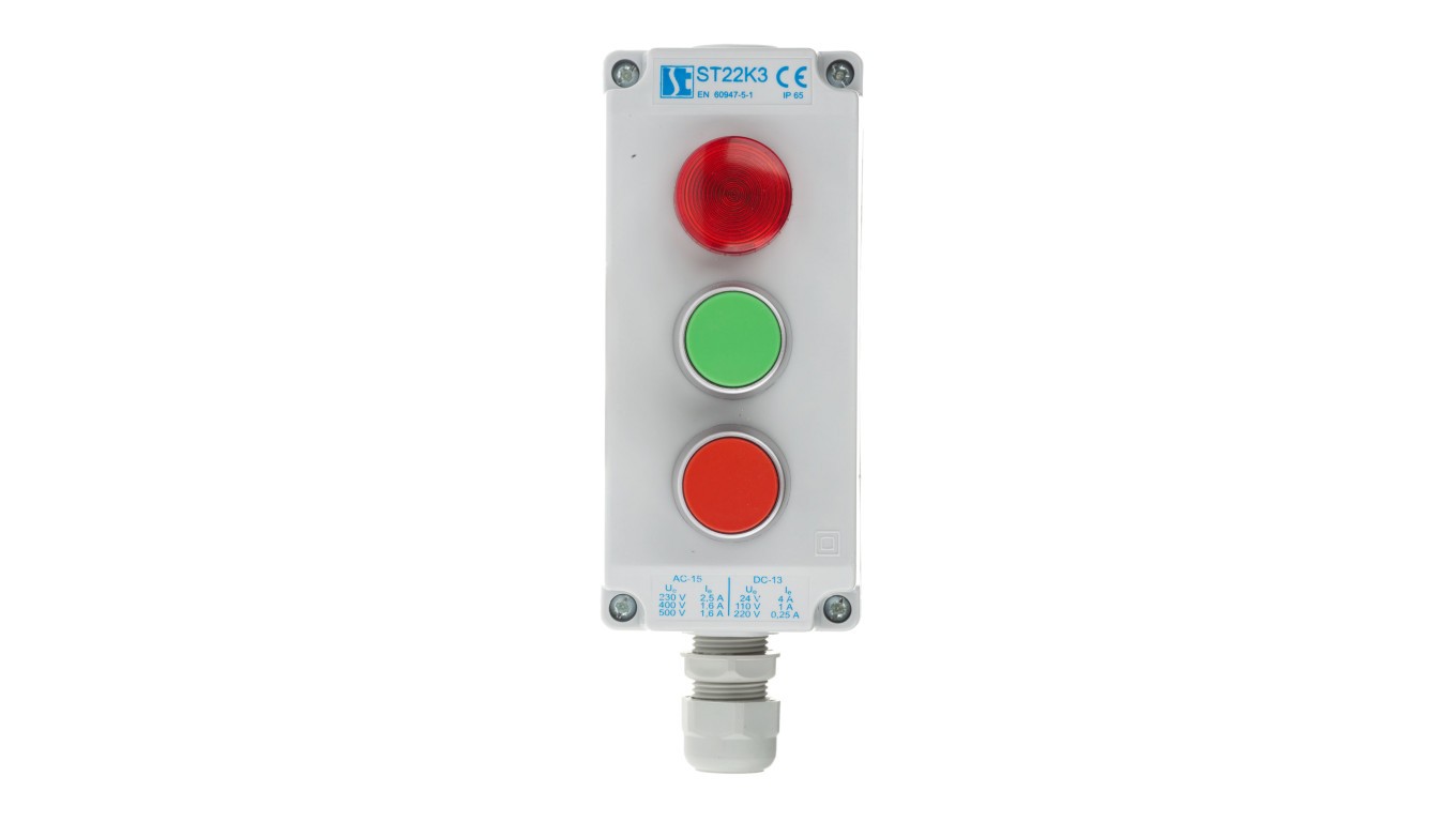 Kaseta sterownicza 3-otworowa zielony/czerwony/lampka czerwona 24V 1Z 1R IP65 1x dławnica M20 szara ST22K3"04-1