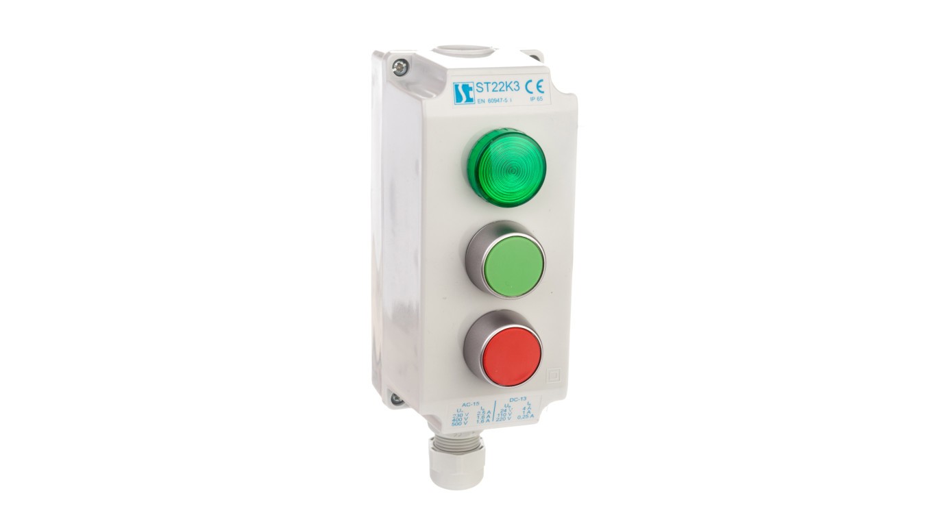 Kaseta sterownicza 3-otworowa zielony/czerwony/lampka zielona 230V IP65 1x dławik M20 szara ST22K3"06-1