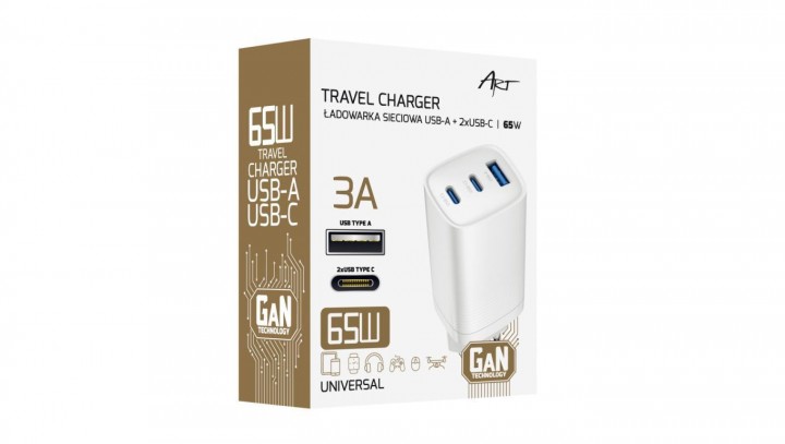 ŁADOWARKA SIECIOWA GaN PD/QC 4.0 2x USB-C 1x USB-A 65W ART