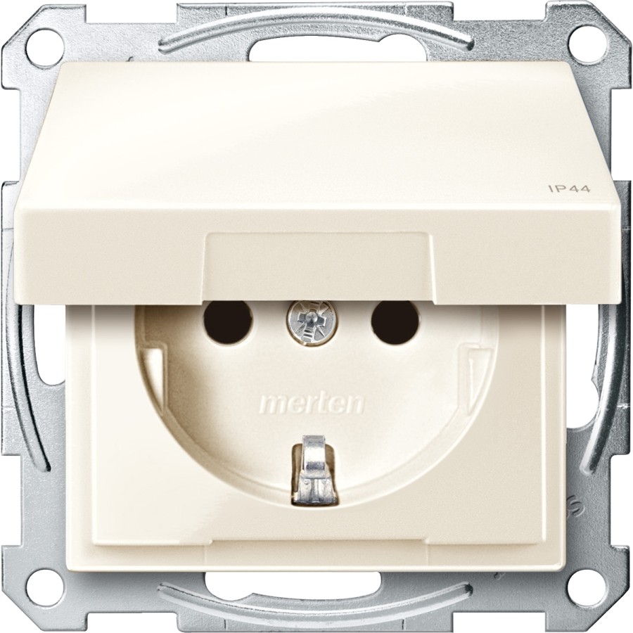 Merten System M Gniazdo pojedyncze SCHUKO IP44 z przesłonami i klapką kremowy MTN2414-0344