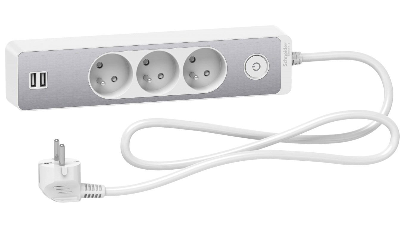 Odace Przedłużacz 3 gniazdowy z łącznikiem 2x USB, 1,5m biały+szczotkowane aluminium ST933U1WA