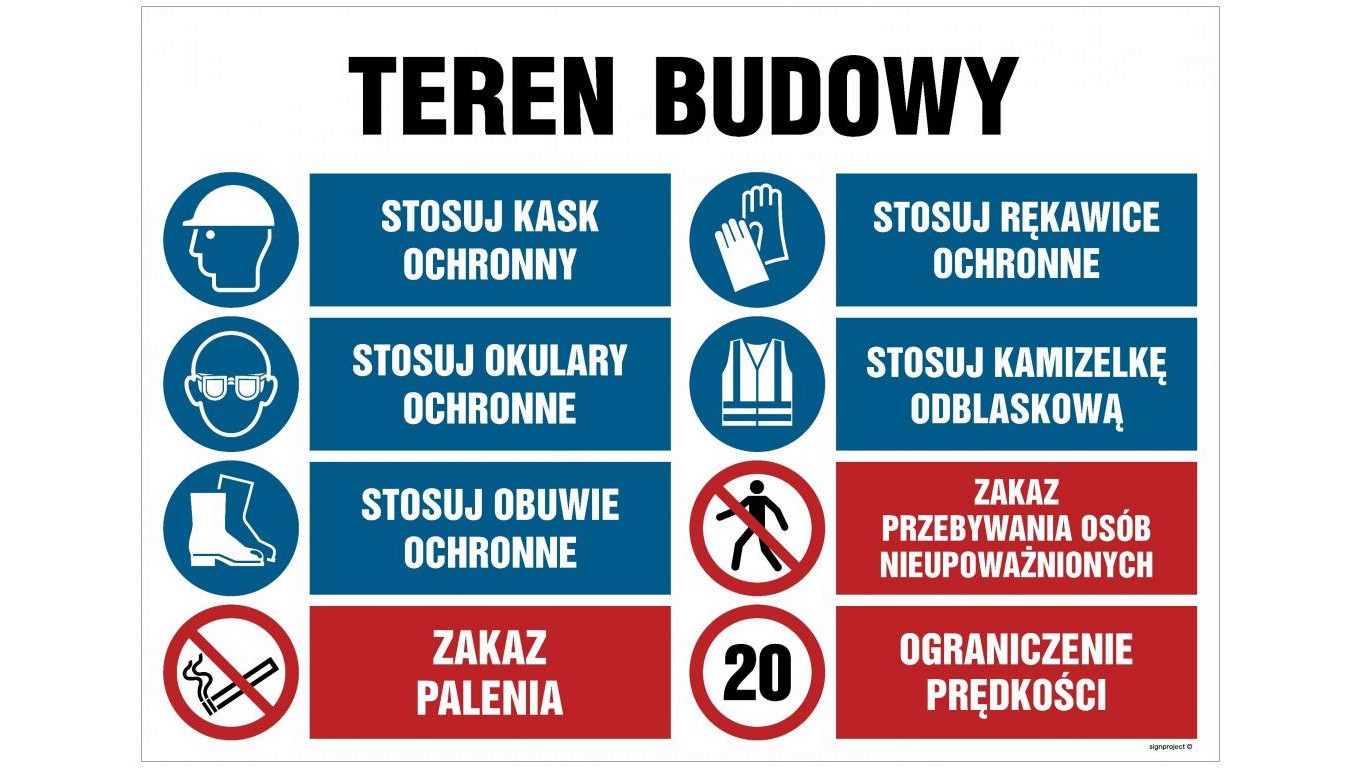 OI018 Teren budowy, Stosuj kask ochronny, Stosuj rękawice ochronne, Stosuj okulary ochronne, Stosuj kamize 100 x 75 cm FN - Foli