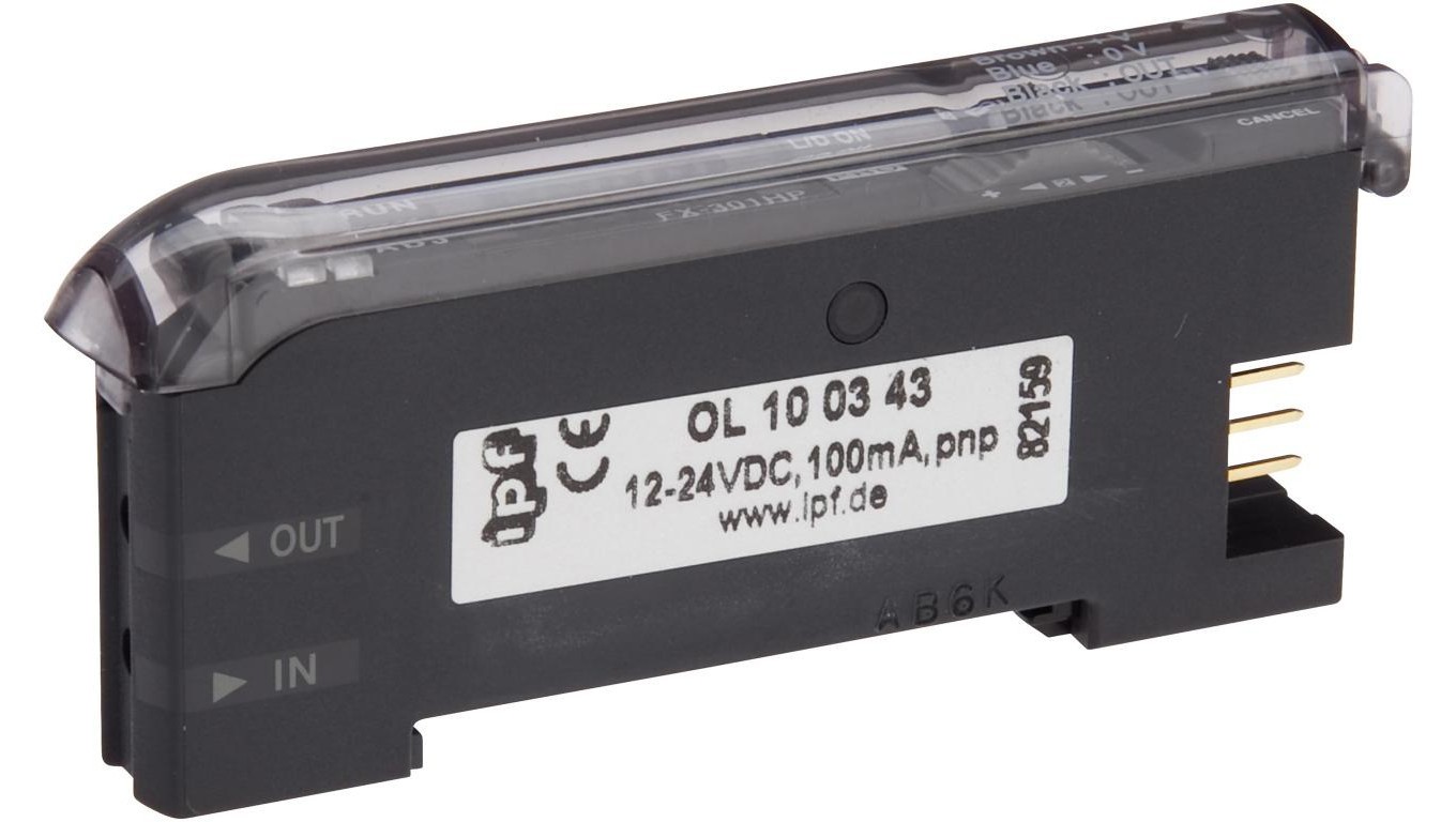 OL100343, wzmacniacz światłowodowy, 30x70x10mm, 12-24V DC, 1x PNP NC/NO, złącze wtykowe 3pin, IP40