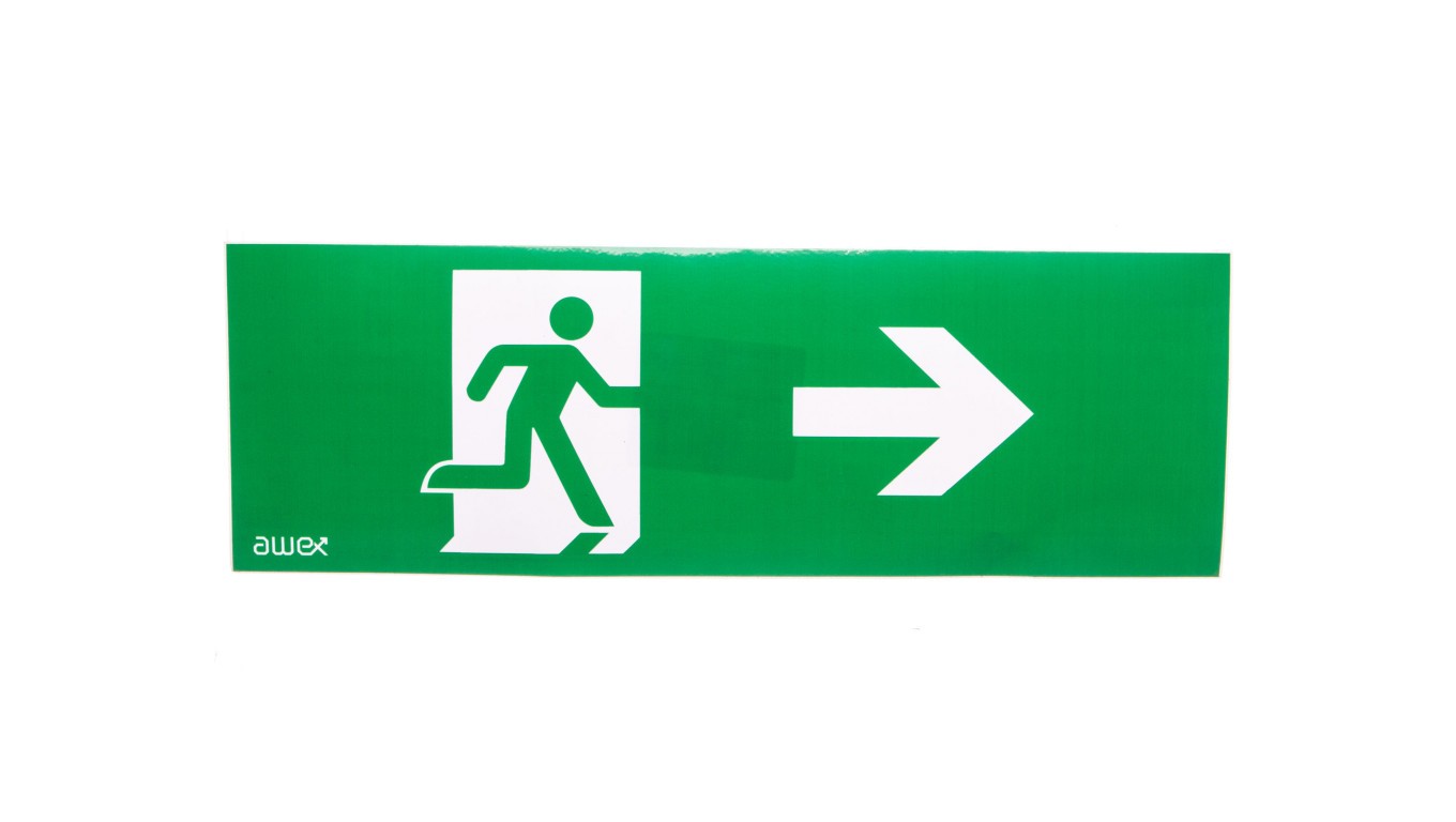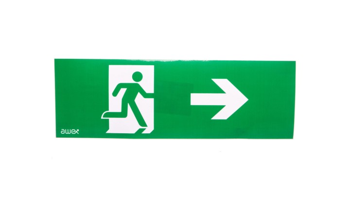 Piktogram 100x300 PM25 człowiek w drzwiach strzałka prawo logo awex (ISO7010)