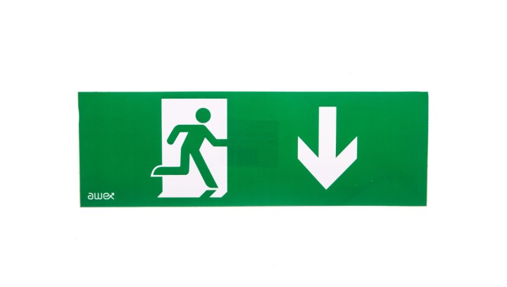 Piktogram 100x300 PM27 człowiek w drzwiach strzałka dół logo awex (ISO7010)