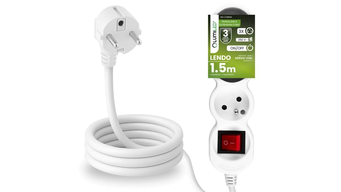 Przedłużacz Sieciowy Kabel z Uziemieniem Listwa Zasilająca 3 Gniazda 1.5m Włącznik ON/OFF Biały Sznur Lendo Lumiled