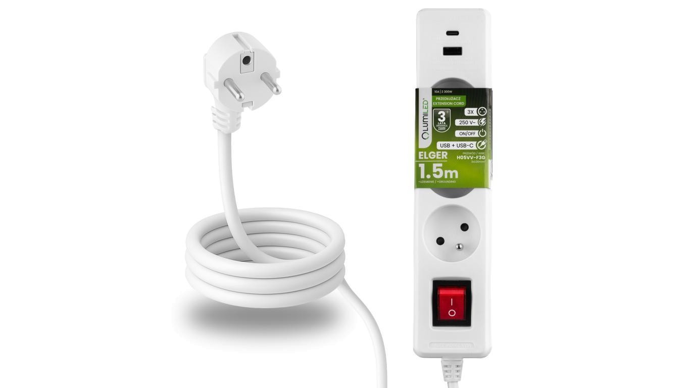 Przedłużacz Sieciowy Kabel z Uziemieniem Listwa Zasilająca 3 Gniazda 1.5m Włącznik ON/OFF Biały USB + USB-C Sznur ELGER Lumiled