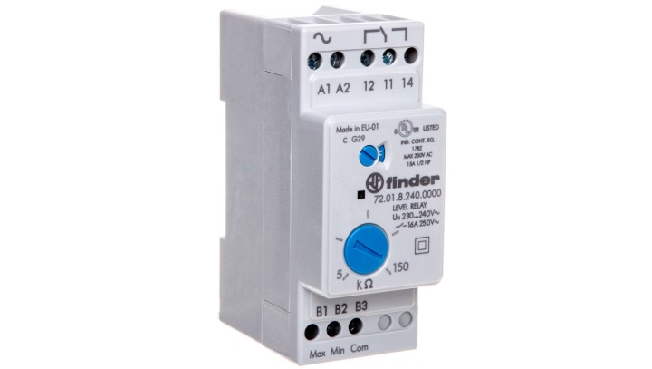 Przekaźnik kontroli poziomu cieczy przewodzących 1P 230V AC funkcja FL, FS, ES, EL regulacja czułości 72.01.8.240.0000