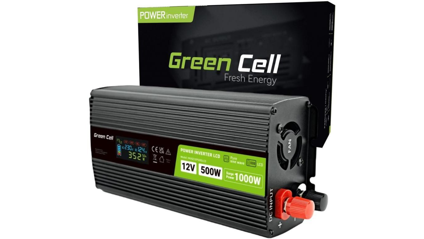 PRZETWORNICA NAPIĘCIA Green Cell PowerInverter LCD 12V -igt/br 230V 500W/1000W CZYSTA SINUSOIDA