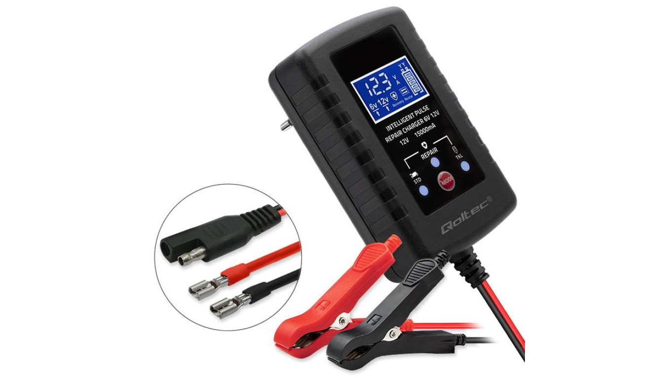 Qoltec Automatyczna ładowarka do akumulatora AGM GEL STD 6V/12V 2A Prostownik z funkcją naprawy i wyświetlaczem LED