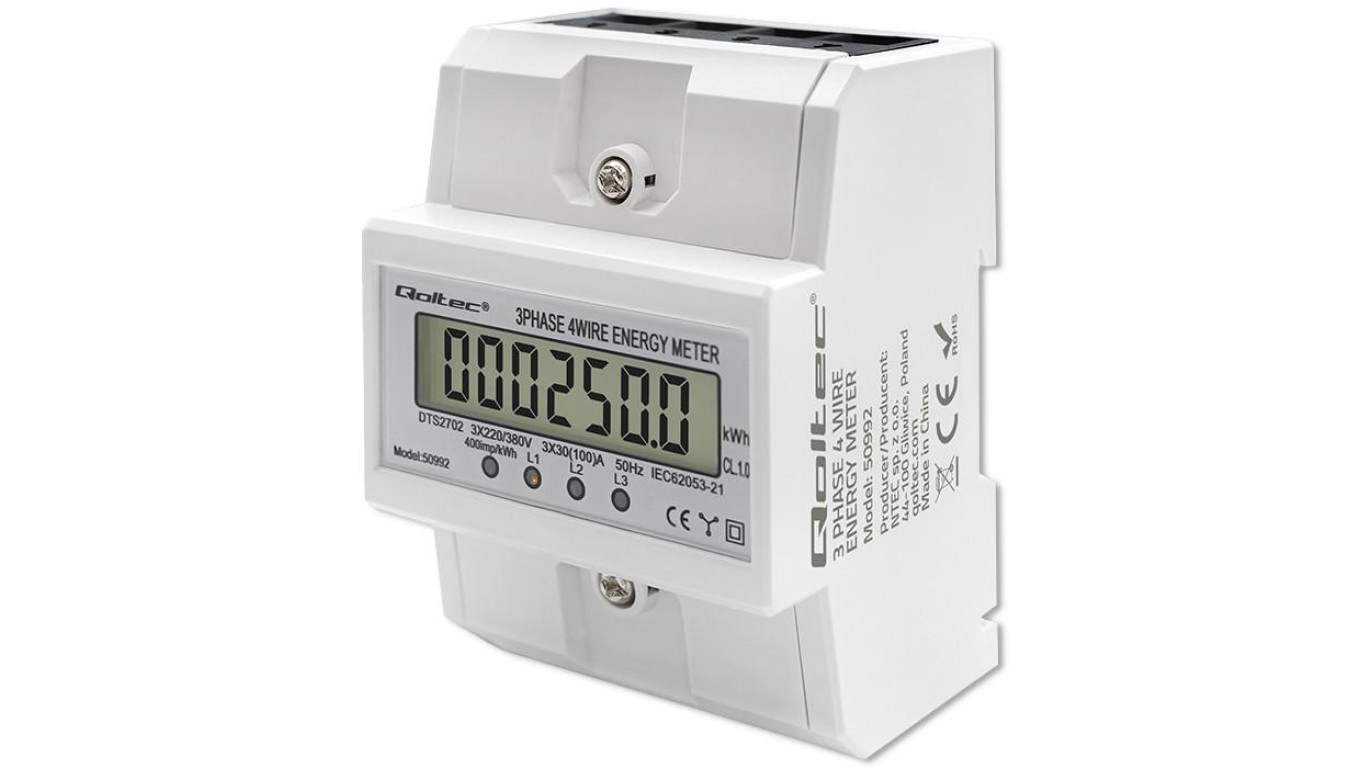 Qoltec Trójfazowy elektroniczny licznik miernik zużycia energii na szynę DIN 400V 100A LCD 4P
