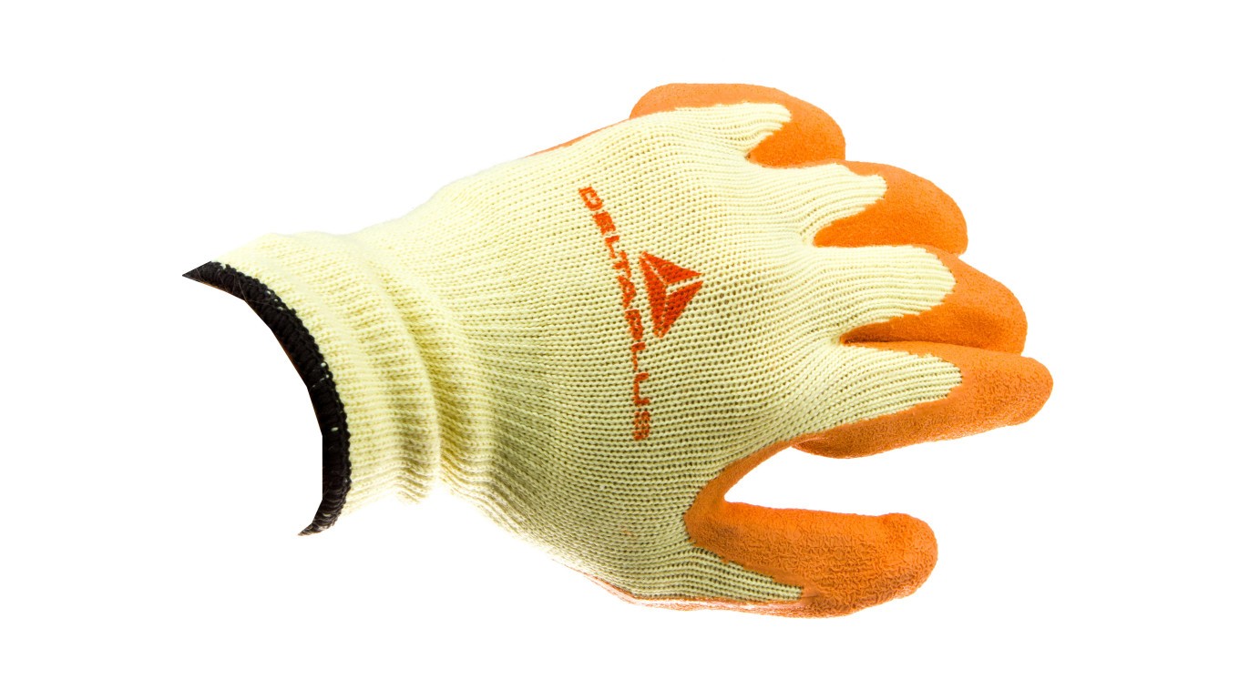 Rękawice dziane z poliestru i bawełny, dłoń i końce palców powlekane Lateksem, ścieg 10 żółto-pomarańczowe rozmiar 9 VE730OR09