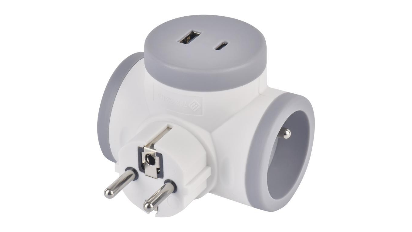 Rozgałęźnik 2×, 1×USB-A+1×USB-C, biało-szary