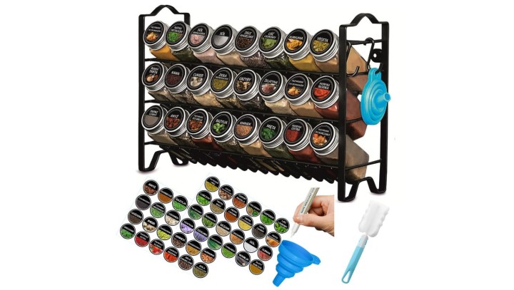 STOJAK NA PRZYPRAWY 24 SZKLANE SŁOICZKI POJEMNIKI ORGANIZER 72 NAKLEJKI