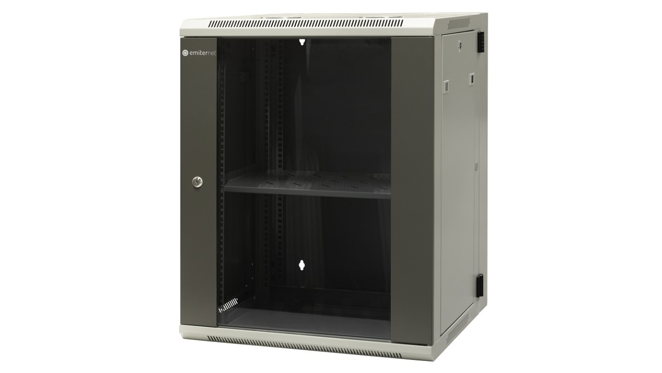 Szafa wisząca dzielona 19 15U, drzwi blacha/szkło, ściągane osłony boczne z zamkiem, tył zamek 600×550×770 szer./gł./wys. mm R