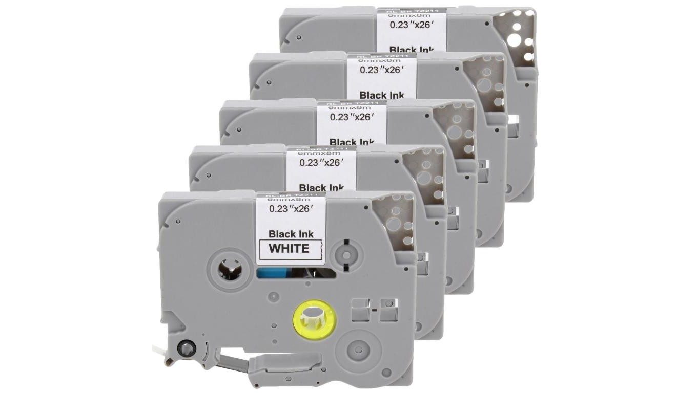 Taśma 5x Tze-211 do drukarki Brother 6mm 8m biała taśma czarny nadruk /5szt./