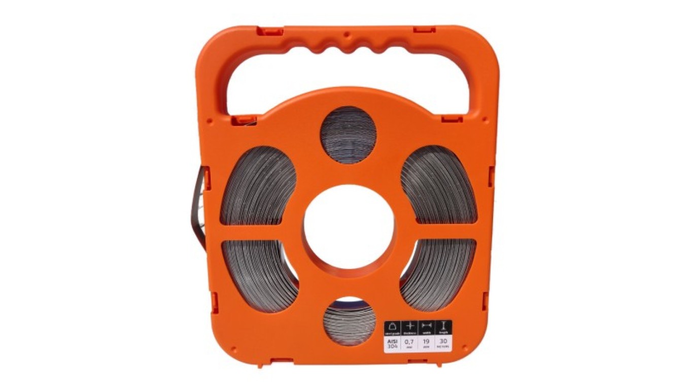 Taśma stalowa 0,7 x 19mm 30m zimnowalcowana nierdzewna gat 304 z uchwytem L-B 4906