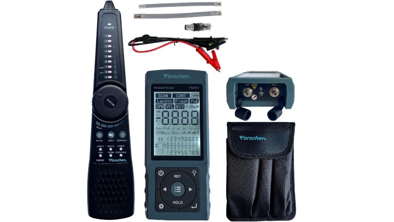 Tester kabli sieciowych RJ45 PREMIUM z pomiarem PoE, mocy optycznej długości przewodu FORSCHER FS8107