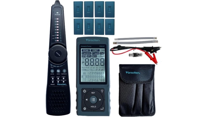 Tester kabli sieciowych RJ45 PREMIUM z pomiarem PoE, mocy optycznej długości przewodu + 8 terminatorów FORSCHER FS8107-8T