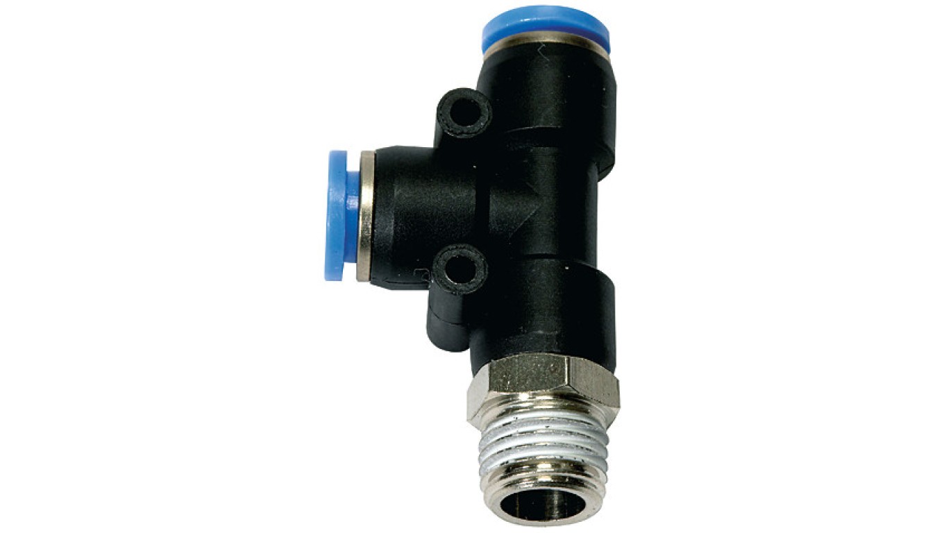 Trójnik wtykowy T obrotowy z tworzywa sztucznego do węża 12, gwint boczny stożkowy R1/2z, 130.012-12