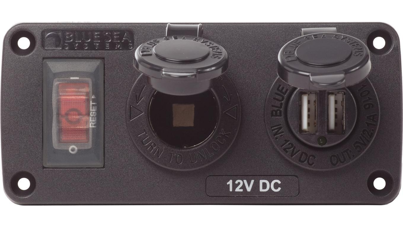 Wodoodporny Panel Blue Sea – Wyłącznik 15A, Gniazdo 12V, Ładowarka USB 2.1A