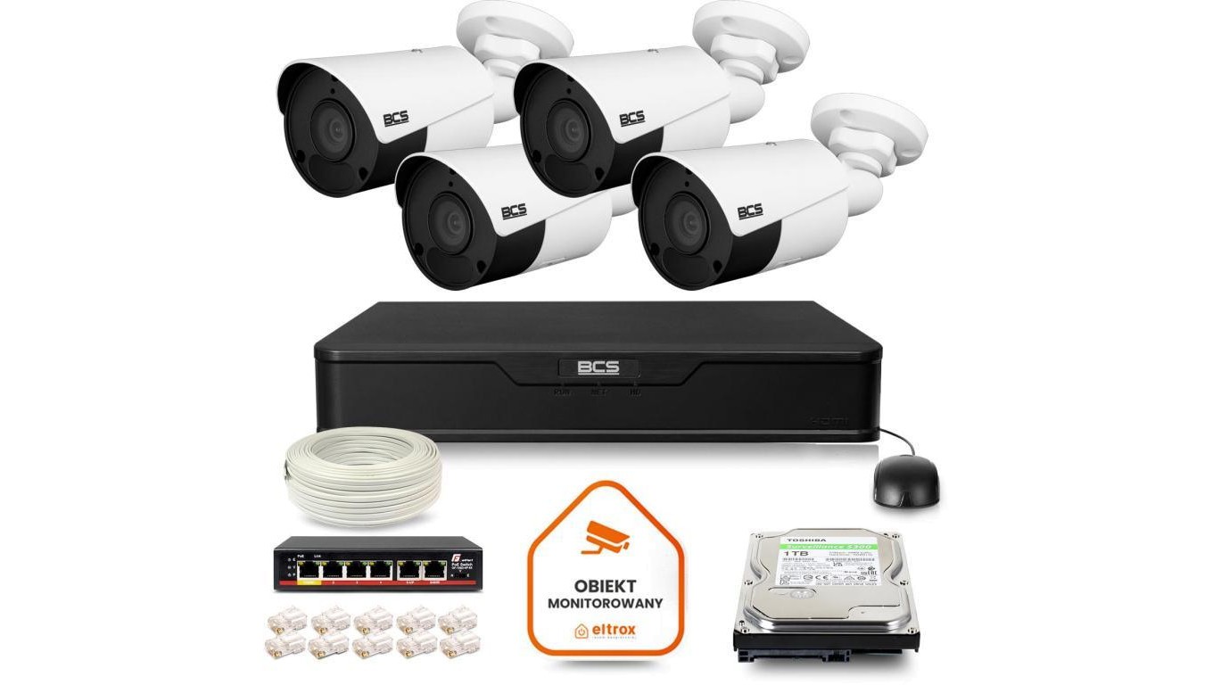 Zestaw monitoringu IP BCS Point 4x Kamera BCS-P-TIP15FSR5 Rejestrator z dyskiem 1TB