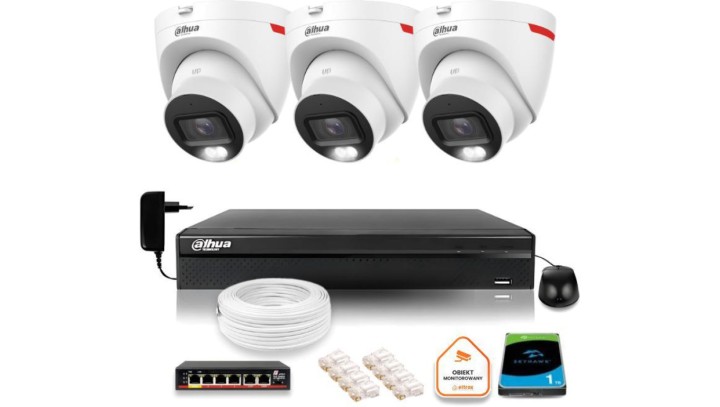 Zestaw monitoringu IP DAHUA 3 kamery zewnętrzne WizColor 2K 30m
