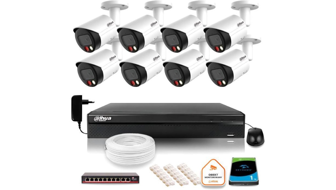 Zestaw monitoringu IP Dahua 8mpx 4K 8 kamer IPC-HFW2849S-S-IL z dyskiem 1TB