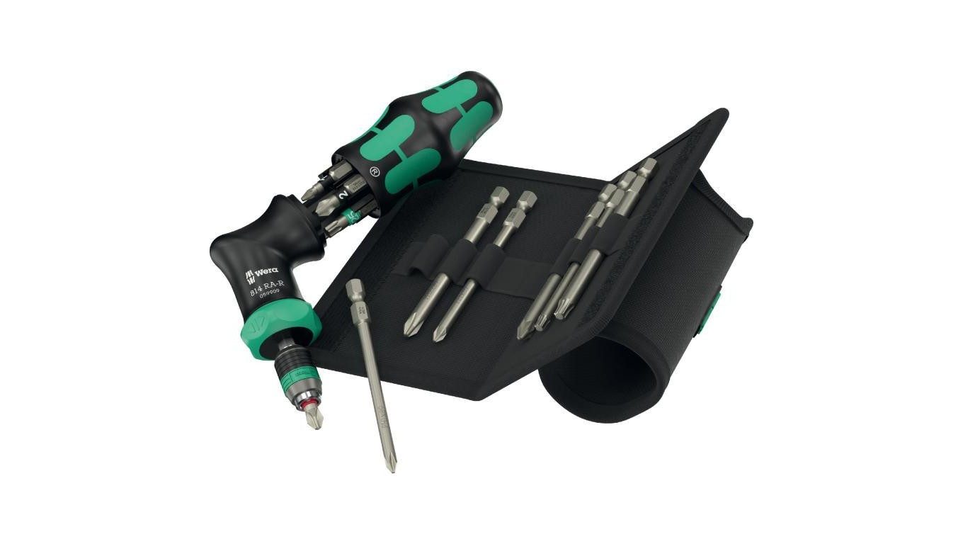 Zestaw wkrętaków i bitów 13 sztuk: rękojeść pistoletowa z funkcją grzechotki + 6 trzpieni + 6 bitów Kraftform Kompakt Pistol RA-